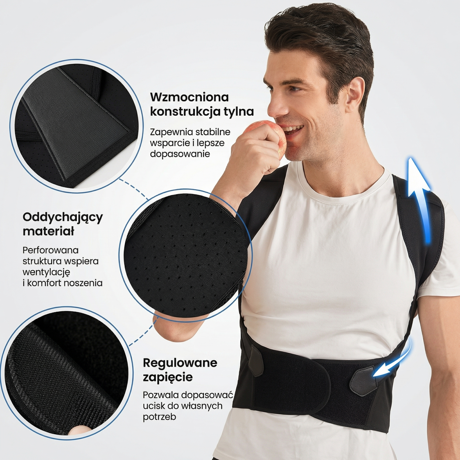 Regulowane paski pozwalają idealnie dopasować korektor do sylwetki, zapewniając wygodę noszenia